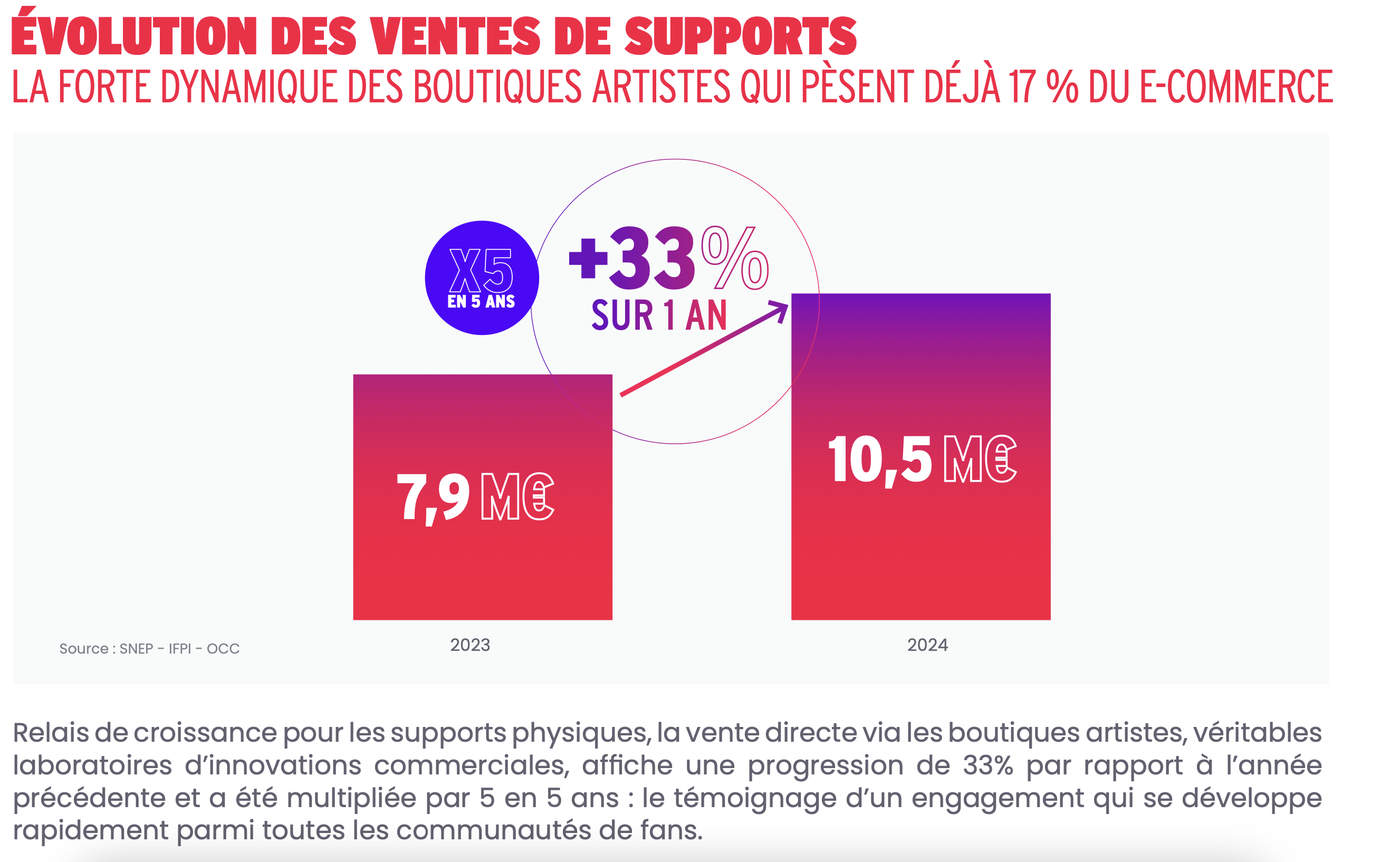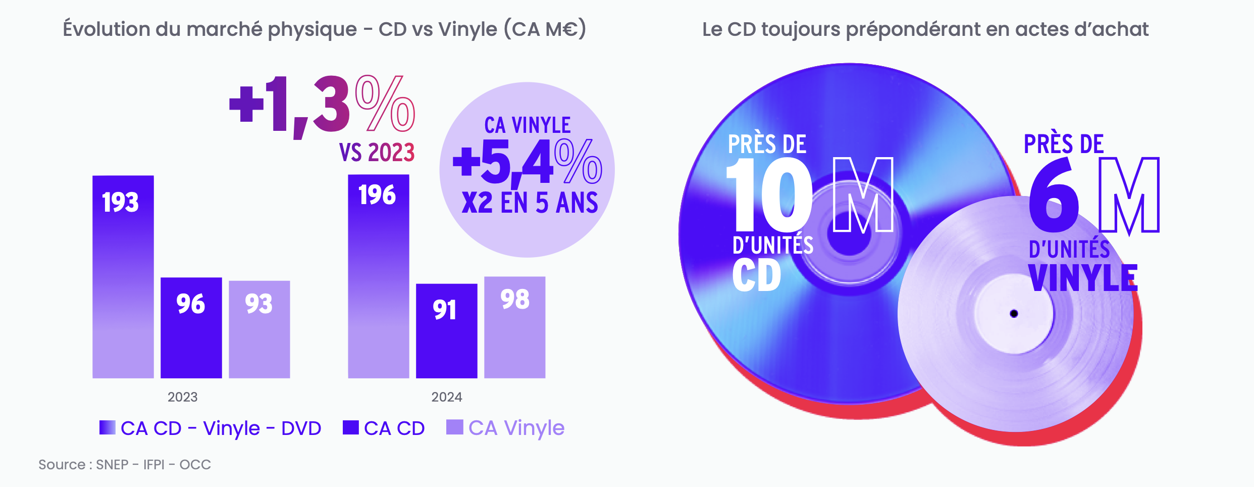 On pourrait croire que le marché de l’album physique est en déclin, et bien non ! En 2024, pour la première fois en 11 ans, les ventes de ces supports sont en croissance (+1,3%), portées par le vinyle, qui génère en France un chiffre d’affaires de 98M€ (multiplié par deux en 5 ans). Si le volume des ventes de CD est toujours supérieur, son CA s’élève, lui, à 91M€.