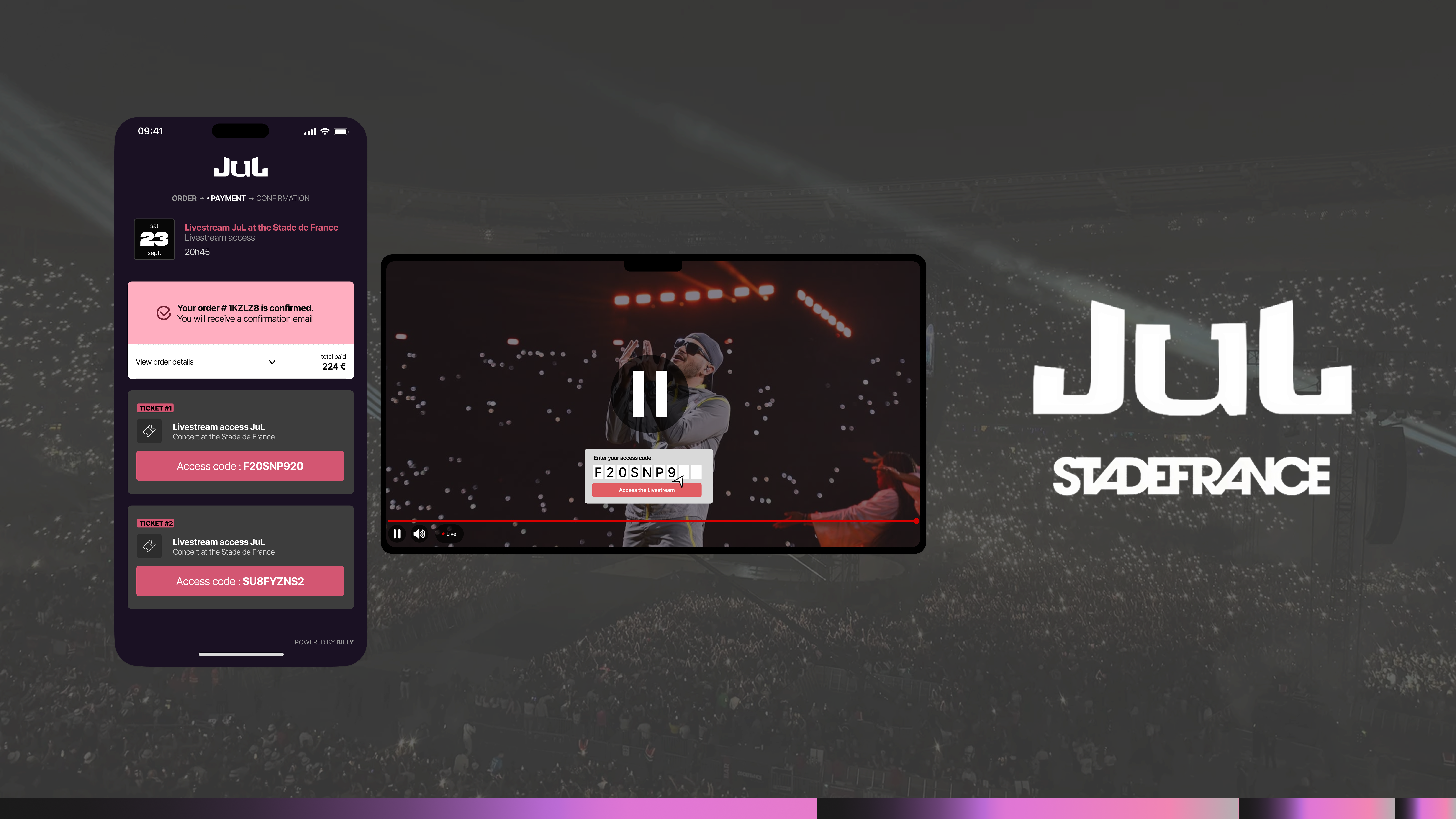 Billy a conçu une plateforme dédiée, entièrement alignée avec l’univers de JUL et un widget en marque blanche. La vente des codes livestream s’est déployée en parallèle de la billetterie physique, créant une expérience à deux niveaux: les spectateurs présents au Stade et les fans connectés dans le monde entier. Dès le lancement, l’infrastructure devait absorber un pic mondial sans friction. Résultat : 380 000 visiteurs, sans interruption de service.